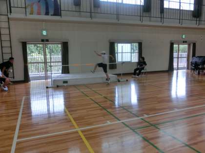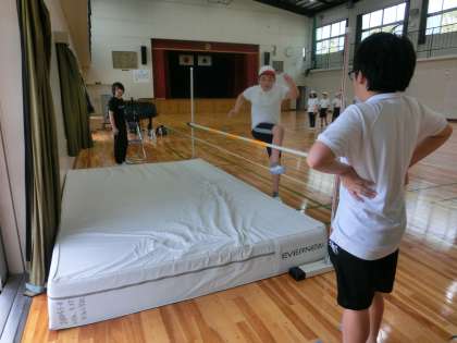 午後も暑い中がんばっていますよ。午後からの授業の様子を見に行くと体育館では、5・6年生が高跳びを行っていました。先週は、ゴムひもを使用し練習をしていました。今日は、本物の高跳びのバーを使って、それぞれ跳べる高さまでチャレンジです。何センチまで飛べたかな。