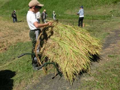 今日は、朝から厳しい暑さになりましたが、5年生では、5月に植えた稲の収穫(刈り取り)の時期となりました。期間中のお世話は、地域ボランティアの方に任せきりになってしまいました。今日の刈り取り作業に際しても地主さんや地域講師、コーディネーターさんなどたくさんの方の協力を得て行いました。みんな初めての体験で簡単にはできませんでしたが、何とか時間内に刈り取りができました。協力してくださったみなさんありがとうございました。