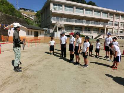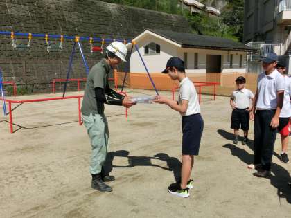 10月になりましたが、日中は30度を超える暑さになっています。8月から始まった運動場の遊具の工事が今日で終了します。この後、工事の検査を経て、検査が合格すると、来週から使用可能予定です。今日は、工事の最終日ということで、全校児童からお礼のメッセージを書いたお手紙を工事現場の監督さんにお渡ししてお礼をしました。ありがとうございました。