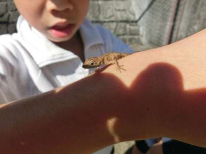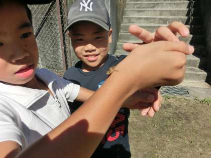 運動場の隅から「これかわいい」と大きな声が聞こえてきました。様子を見に行くとトカゲを捕まえて遊んでいました。トカゲのあとは、カマキリです。いろんな生き物を捕まえて遊んでいます。