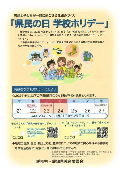 11月22日(金)「県民の日学校ホリデー」です。学校はお休みになります。子どもたと有意義なお休みにしてください。