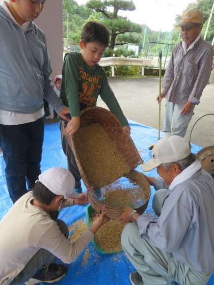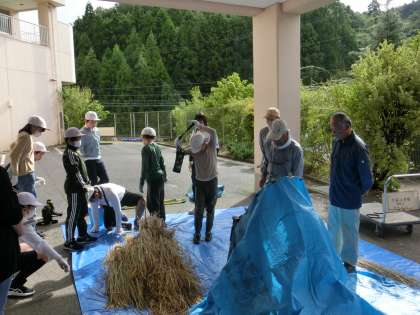 5年生は、先日収穫した稲の脱穀体験をしました。先日の刈り取り作業に続いて地域講師にきていただき、昔の明日踏み式の脱穀機を使って脱穀の作業を体験しました。