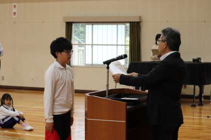 後期が始まりました。1時間目は、始業式に先立って表彰伝達を行いました。夏休みの作品募集の表彰を行いました。始業式では、各学年の代表児童によるスピーチを行いました。