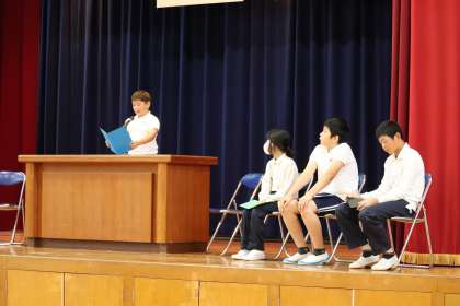 各学年の学習内容や行事への取り組みへの反省と後期に向けての目標を発表することができました。校長先生からは、入学式・始業式でお願いした3つのことについての振り返りの確認と後期に向けて様々ことにチャレンジするようにお願いの話をしました。
