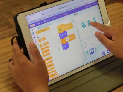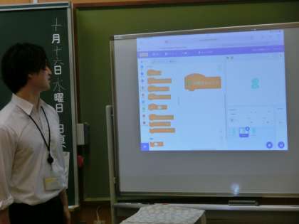 今日は、ICT支援員さんの来校日です。各学年1時間ずつタブレットを使った学習をしました。各学年に合わせた内容でICT機器の専門の先生による授業です。写真は5年生の授業です。数字が「3,2,1」とカウントダウンするプログラムを作成中です。