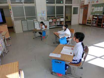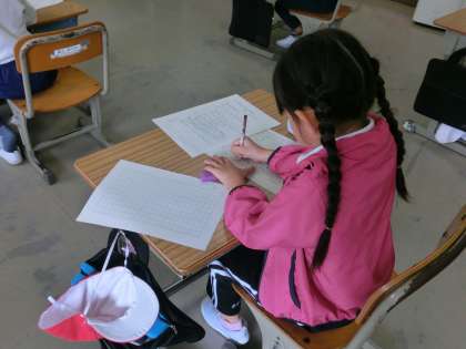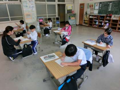運動会に向けての練習も頑張っていますが、国語の勉強もがんばっています。1年生の3人は先生の話を真剣に聞いている姿が見られました。2年生では、運動会に向けて頑張りたいことを作文にしていました。
