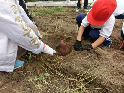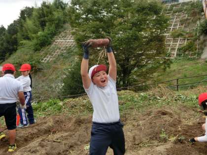 本日最大のイベントのイモ堀りを行いました。5月にみんなで苗を植えてから170日目の収穫です。厳しい夏の暑さや雑草の襲来にも耐え実りの秋を迎えました。2日ほど延期しましたが、一人の欠席者もなく、全校児童での収穫となりました。2名の地域講師の指導のもと、イモを傷つけないよう手掘りでの作業でした。ツルのあった場所を中心に回りを丁寧に掘っていくと大きなイモが見えてきて大喜びでした。