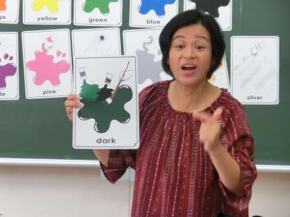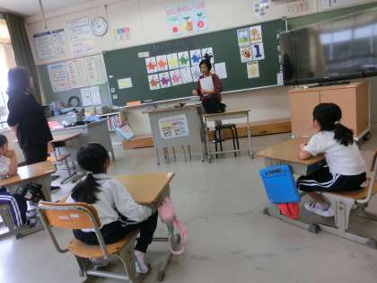 運動会の練習の後は、外国語の時間です。ALTの先生の指導のも英語で色の学習をしていました。「グリーン」「イエロー」など、正しく発音できたかな。練習した後は、英語でゲームをして楽しみました。