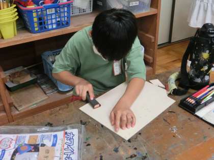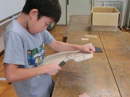 5年生の図工は、糸のこぎりを使っての作品作りです。ベニヤ板を糸のこを使って自由に切っています。切った後はサンドペーパーで磨いています。さていったい何ができるのでしょうか。お楽しみに。