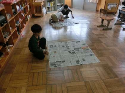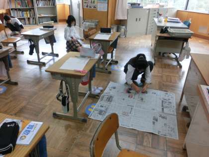4年生の算数は、面積の学習をしています。今日は、新聞紙を使って実際に1平方メートル大きさを作り、大きさを確認していました。土地の価格のニュースで耳にする1平方メートルってこの大きさなんだ。これだけの大きさで数億円する土地もあるんですね。