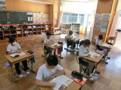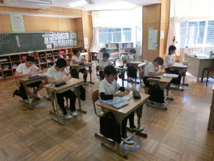 全校練習の後は、国語、社会、算数の学習です。4年生では、国語の音読をしていました。5年生では、社会の自動車工業の学習、6年生は算数、三角形の面積の学習をしていました。みんな、真剣に取り組んでいる姿がみられました。
