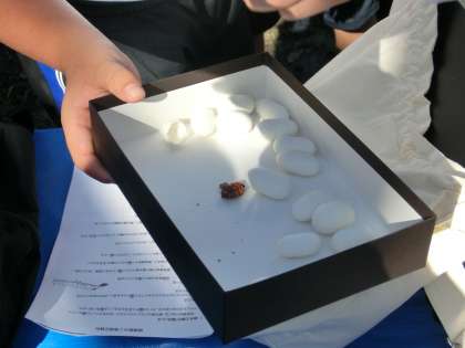 5年生ふるさとウォーク2か所目の見学先は、穂積製糸工場跡見学です。120年前にわずか22年間ですが、この地に大規模な製糸工場があったことを学びました。松平まちづくりのガイドさんの説明を聞きました。実物の蚕を手に取り、蚕の中身まで見せていただきました。