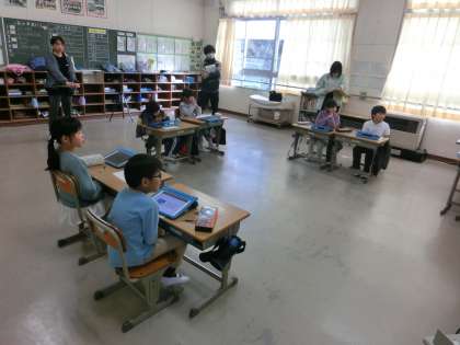 2年生で研究授業を行いました。三角形と四角形の特徴についてみんなで考えながら仲間分けをしました。また、タブレットを使ってそれぞれの意見を交換し、途中ででは、ペアになって三角形と四角形についてお互いに説明をしながら違いを明確にしました。