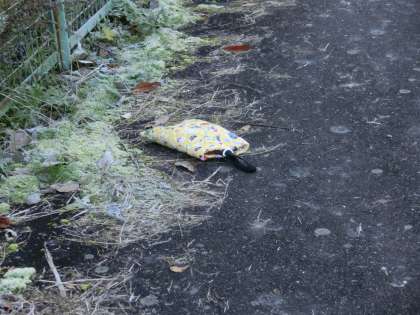 登校の様子を見回っていると児童数人が南門に駆け寄ってきて「落とし物をした」「シューズ袋を途中で落とした」という報告を受け、通学路を捜索に行きました。すると、話の通り通学路で見つけました。無事に見つかってよかったです。今朝は、それ以外に金曜日の下校時に落としてしまったと思われる歯ブラシセットの袋を見つけました。