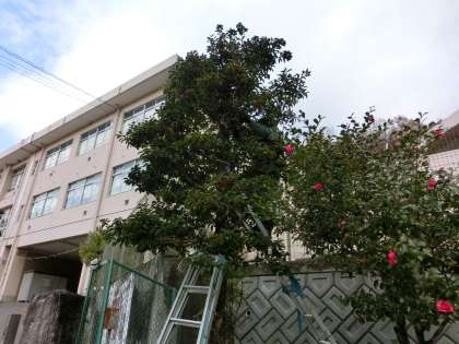 正門の木の上に何か動くものが、サルの出現か思いきや、校内整備員さんです。今日は、校内整備員さん来校日です。朝から正門付近の木の剪定作業をやっていただきました。