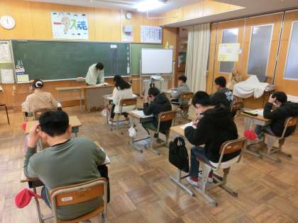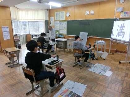 6年生の教室は書写の時間です。今年最後の書き初め練習です。あとは、年明けの書き初め大会です。