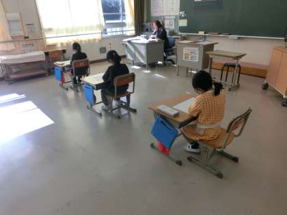 なかよしタイムでいっぱい遊んだ後は、1年生はテストです。漢字のテストと算数のテスト。テストの隊形になって真剣に取り組んでいます。