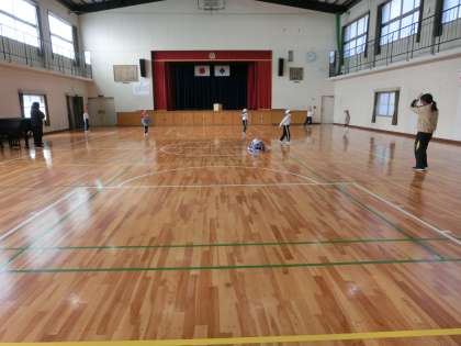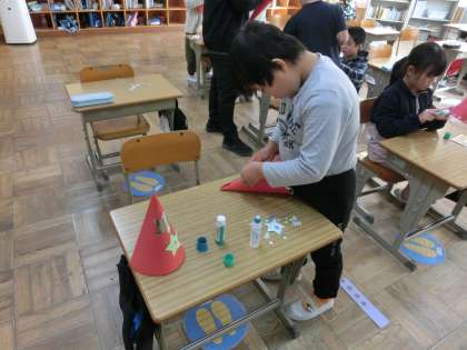 1・2年生は体育館でおにごっこ、3年生は、クリスマス会の小道具づくりに夢中です。