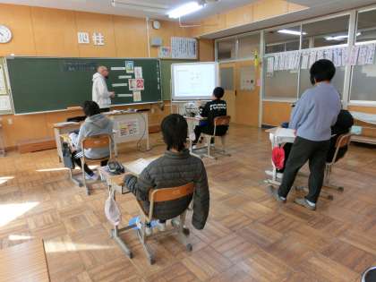 4年生は、今年最後の書き初め練習です。真剣な様子です。5年生は、算数の授業、商品の値段の差を言葉を使って表現しています。6年生は、外国語の授業です。ALTの先生と発音練習です。