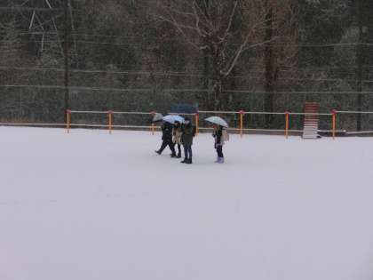 今朝は、今シーズン初めての積雪になりました。雪が降る中元気に登校してくる姿が見られました。登校前に職員で手分けをして階段や門の付近の雪かきをしました。