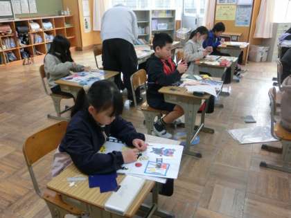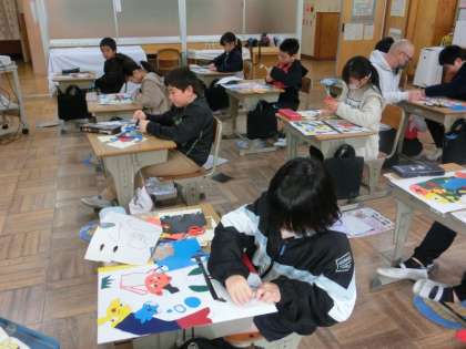 3年生は、図工の作品作りに取り組んでいました。今回の課題は、タックシートを切って、丁寧に貼ることです。イメージした形に切った後、シートの裏紙をはがすのに一苦労。貼るときも落ち着いてゆっくりと。とても集中して活動をしていました。