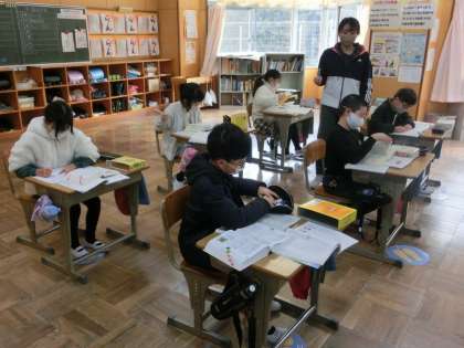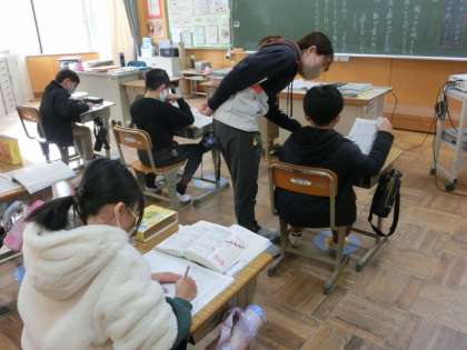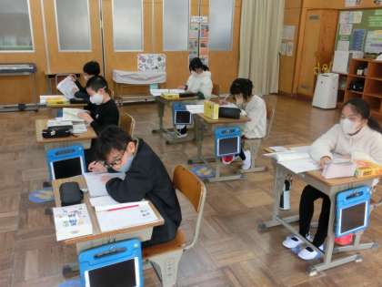4年生は、机の上に国語辞典が置いてありました。国語の学習で、1つの言葉でもいろいろな意味をもつ場合があり、実際に辞典で調べて確かめる活動をしていました。意味を調べて知ることも大切ですが、辞書の引き方に慣れたりや用例から言葉の使い方を学ぶのも大切だと思いました。