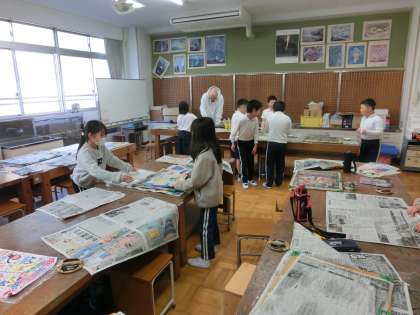 なかなかきれいに色が出ないようです。3年生の図工は紙版画の印刷をしています。着色剤が付着した紙シートで版を作り、霧吹きで水をかけ印刷用紙を載せて写し取る版画です。思ったより色が出ないため、苦労していました。