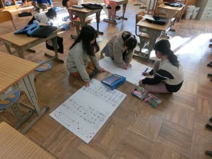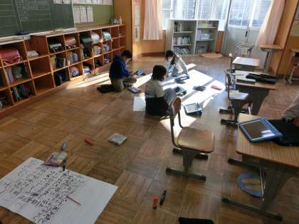 3年生では、大豆の栽培を行い、現在、大豆を使った料理(食品)などについて調べています。今日は、調べたことをまとめる作業をしています。
