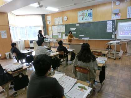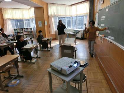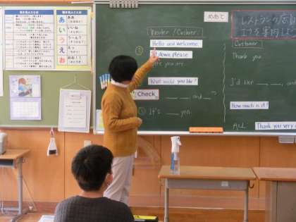 5年生は、1月になって初めてのALTの先生の授業です。今日の内容は「レストランの店員になって案内しよう」ということで、案内の仕方を学習しています。みんな、楽しそうに元気に店員になった気分でお客さんを案内する内容を英語で発していました。