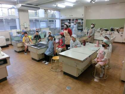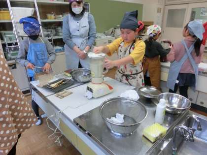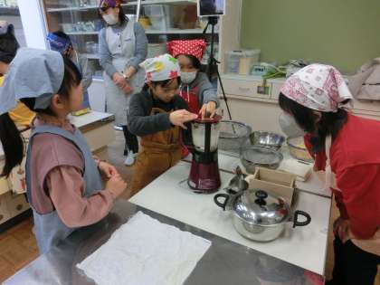 今日は3年生は、2時間目から豆腐作りに挑戦しました。これまで自分たちで大豆からできるものを調べ、その中の豆腐作りに挑戦しました。たくさんの先生方のお手伝いをいただきながら3班に分かれて作業開始です。昨日から水に浸した大豆をミキサーにかけたあと煮込み、絞り、にがりを入れる。様々な工程がありますが、確認しながら進めました。