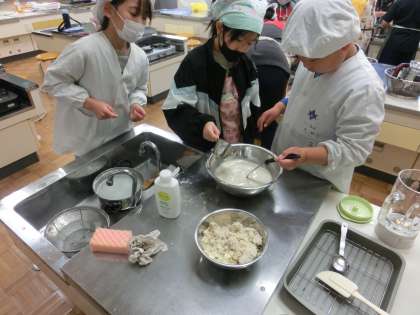 最後ににがりを投入し、固まるのを待ちましたがなかなか固まりませんでした。その間、しぼりかすのオカラを使ってサラダやドーナツづくりにも挑戦しました。