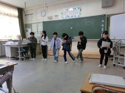 2年生は学習発表会に向けて練習をしていました。一人ずつセリフを覚え、少しずつ動きを入れながら、順番に発表していました。