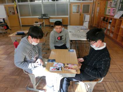 6年生のなかよしタイムです。集中して勉強したあとです。歴史カードで歴史の勉強をしながらゲームをして楽しんでいます。