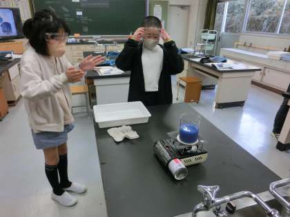 その2 4年生では、理科の授業です。今日は、ビーカーの水を温めて水の温まり方の実験です。5・6年生も学習発表会の振り返りをしていました。
