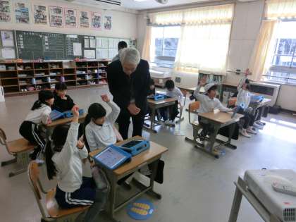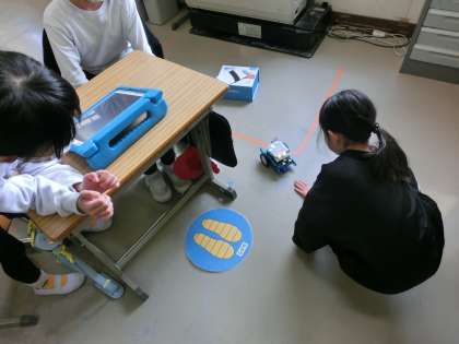 今日は、ICT支援員さんの来校日です。今日は、タブレットを使って簡単なプログラムを作ってロボットを操作する学習です。ロボットの調子が悪く思うように動かなかったようですが、少しだけプログラムの仕組みが分かったような気がします。