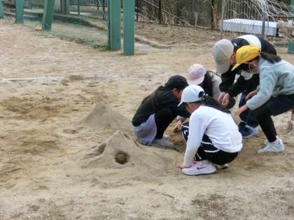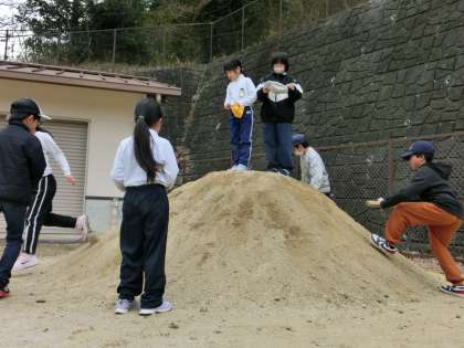 やっと寒さが峠を越したような温かい日差しが差してきました。子どもたちは元気に外遊びです。運動場の隅に新しい遊び場ができました。運動場改修工事で出た土を業者さんにお願いして山を作ってもらいました。少し固めてもらたので山に登って遊んでいます。