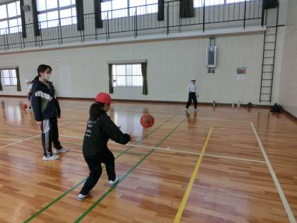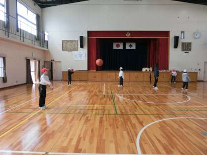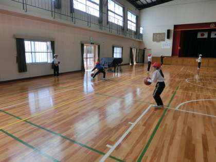3・4年生の体育は、今日からバスケットボールです。ドリブルをして足の下を通した後にパス。ボールが重たくてなかなか遠くへのパスが難しいようです。