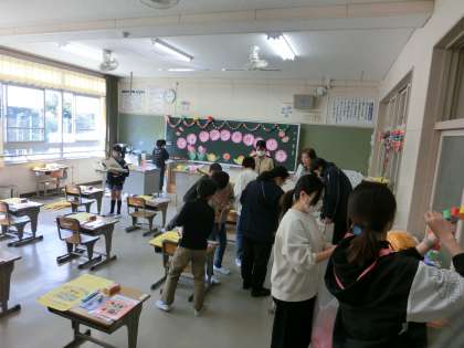 朝から快晴に恵まれ、校庭の桜のはなが色鮮やかに見えます。明日の入学式を迎えるために今日は、新5・6年生が準備のために登校してきました。体育館では掃除をして椅子を並べたり、花を並べたりしました。教室も新しい教科書を並べて新1年生の入学の準備が整いました。