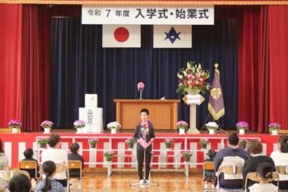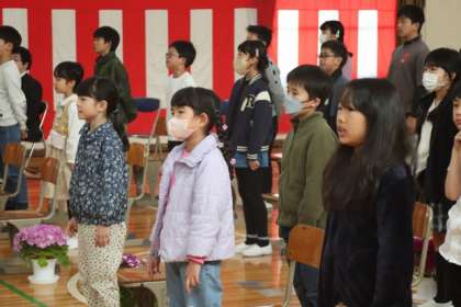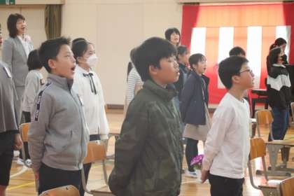 代表児童の歓迎の言葉と校歌斉唱の様子です。全校の元気な歌声で迎えました。