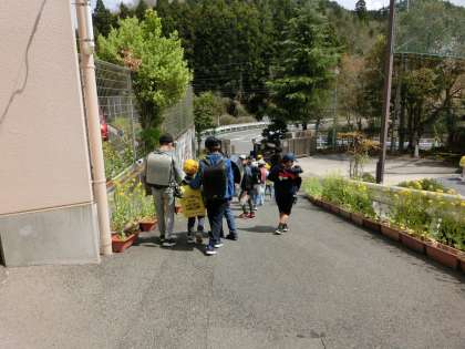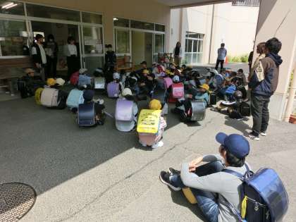 下校時刻になりました。昨年度末から下校時の集合整列場所をワークスペースからピロティに変更しました。幸海町の児童は、正門から出ています。来週も元気に来てくださいね。さようなら。