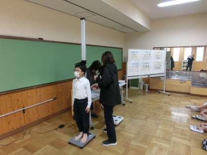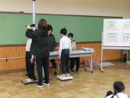 年度初め恒例の身体計測を行いました。身体計測の前に保健の先生から健康体操の指導を受けた後に計測を行いました。さて、1年でどれだけ伸びたかな。