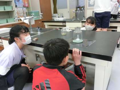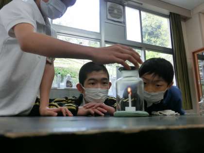6年生の理科は、物の燃え方の学習です。ろうそくを普通に燃やすときとびんの中に閉じ込めた時の燃え方にはどのような違いがあるか調べました。