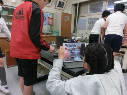 6年生は、物の燃え方の続きです。火を燃やし続けるにはどうしたよいか調べる実験です。タブレットを使い録画をしながらの観察です。