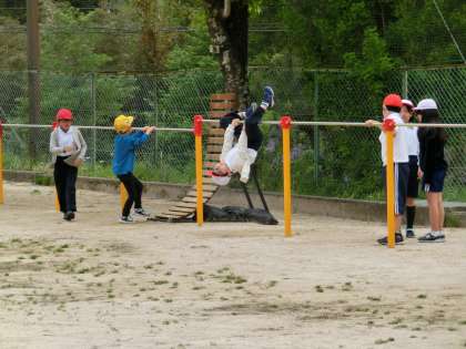 なかよしタイムになると真っ先に飛び出しくる4年生、1年生も交じってサッカーや鉄棒、ブランコ。