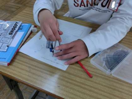 6年生の算数の時間は、点対称な図形について学習しています。点対称の性質を使ってコンパスで作図をしています。思うように描くことができず苦労していました。