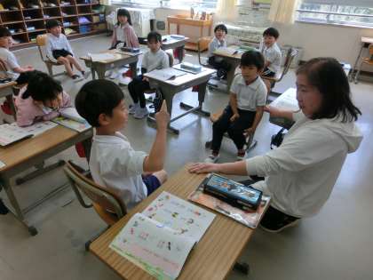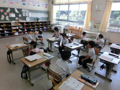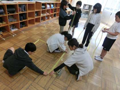 ゴールデンウイークが明け授業が再開されました。どの教室からも活発な子どもたちの声が聞こえてきました。1年生の教室では、ペア学習のスタートです。ペアの組み方とペアで意見交換の約束事を一生懸命に学んでいました。5年生の教室では1立方メートルについてみんなでタフロープをつなぎ合わせながら大きさを確認していました。