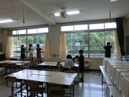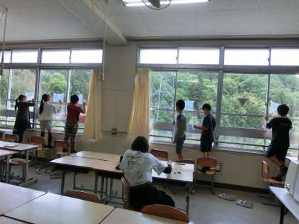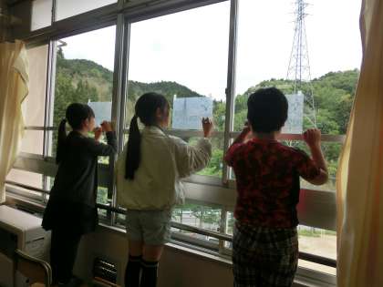 教室の窓から外をのぞきながら何かを描いている姿を見かけました。何をしているかというと、窓に透明なシートを貼り、そこから見える風景を写し取っていました。写し取ったあとは、カラーシートで写し取った景色を色付けをしていく予定です。どんな作品になるか楽しみですね。