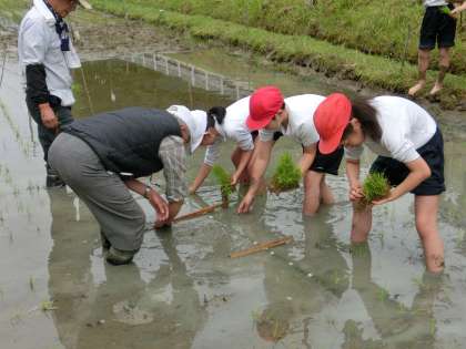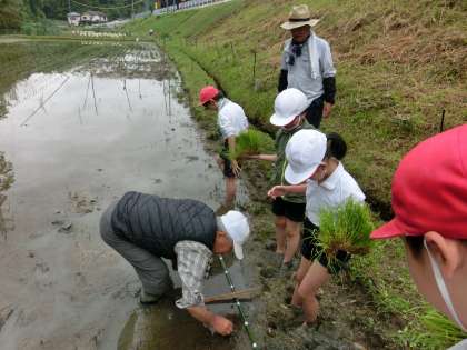 本校では、地域の方ご協力をいただき田んぼの一部をお借りして毎年田植えから収穫までの体験活動を行っています。今年度もお借りした田んぼの地主の方とボランティアの協力をいただき貴重な活動ができました。裸足で田んぼの中に入るのに少し抵抗がありましたが、植え始めると要領よく用意した苗をすべて植えることができました。終わった後の児童の感想には、手作業で植えることは大変だけど、貴重な体験ができました。という感想がありました。協力いただきました方々にお礼を申し上げます。