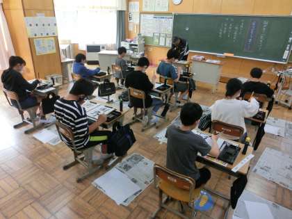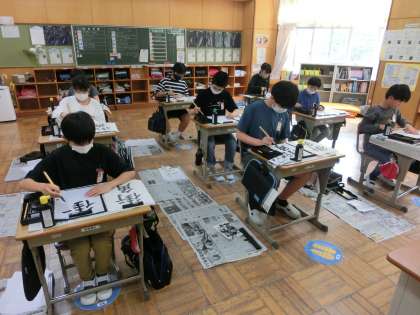 6年生は習字の時間です。「街角」という字に挑戦です。用紙に基準の折り目を付け、1画、1画ていねいに集中して書いていました。まるで書初め大会のようです。