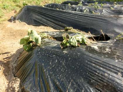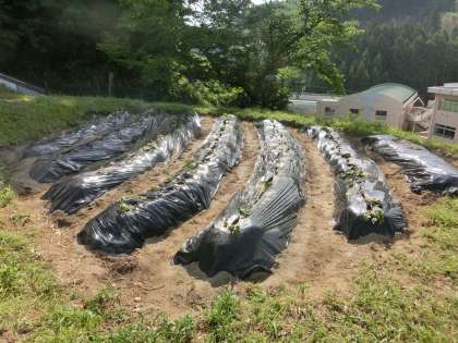 2日目のイモの苗の様子です。2日間の日差しで少ししおれていましたが、昨日の夕方の水やりで少し元気を取り戻したようです。